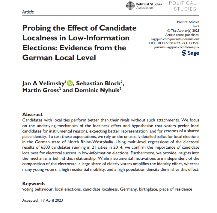 “Probing the Effect of Candidate Localness in Low-Information Elections: Evidence from the German Local Level” Posted bygoetzklausMay 30, 2023November 15, 2023Posted inPublikationen New paper by PD Dr. Martin Gross. You can read it in full by clicking this link. (https://doi.org/10.1177/00323217231173505) Share this: Click to share on X (Opens in new window) X Click to share on LinkedIn (Opens in new window) LinkedIn Related