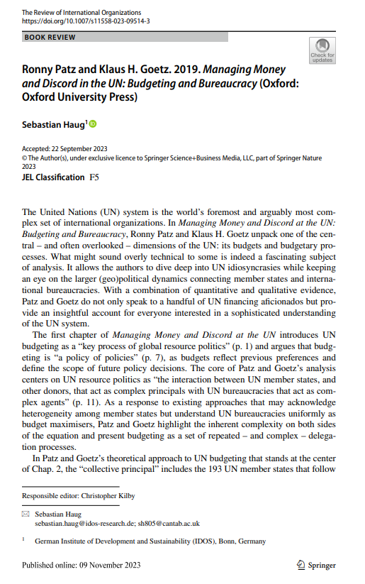 Book Review for “Managing Money and Discord in the UN: Budgeting and Bureaucracy” by Prof. Klaus H. Goetz and Ronny Patz Posted bygoetzklausNovember 14, 2023November 14, 2023Posted inAktuelles Read the full review by Sebastian Haug by clicking this link. You can read the book itself on the Oxford Academic website. Share this: Click to share on X (Opens in new window) X Click to share on LinkedIn (Opens in new window) LinkedIn Related