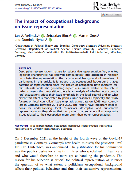 Published in the Journal for West European Politics, the article focuses on the impact occupation has on members of local councils in Germany. Co-authoring the paper are Jan A. Velimsky, Sebastian Block & Dominic Nyhuis.