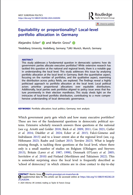 Published together with Alejandro Ecker in the Journal of West European Politics, the paper analyses executive portfolio allocation at a local level in Germany.